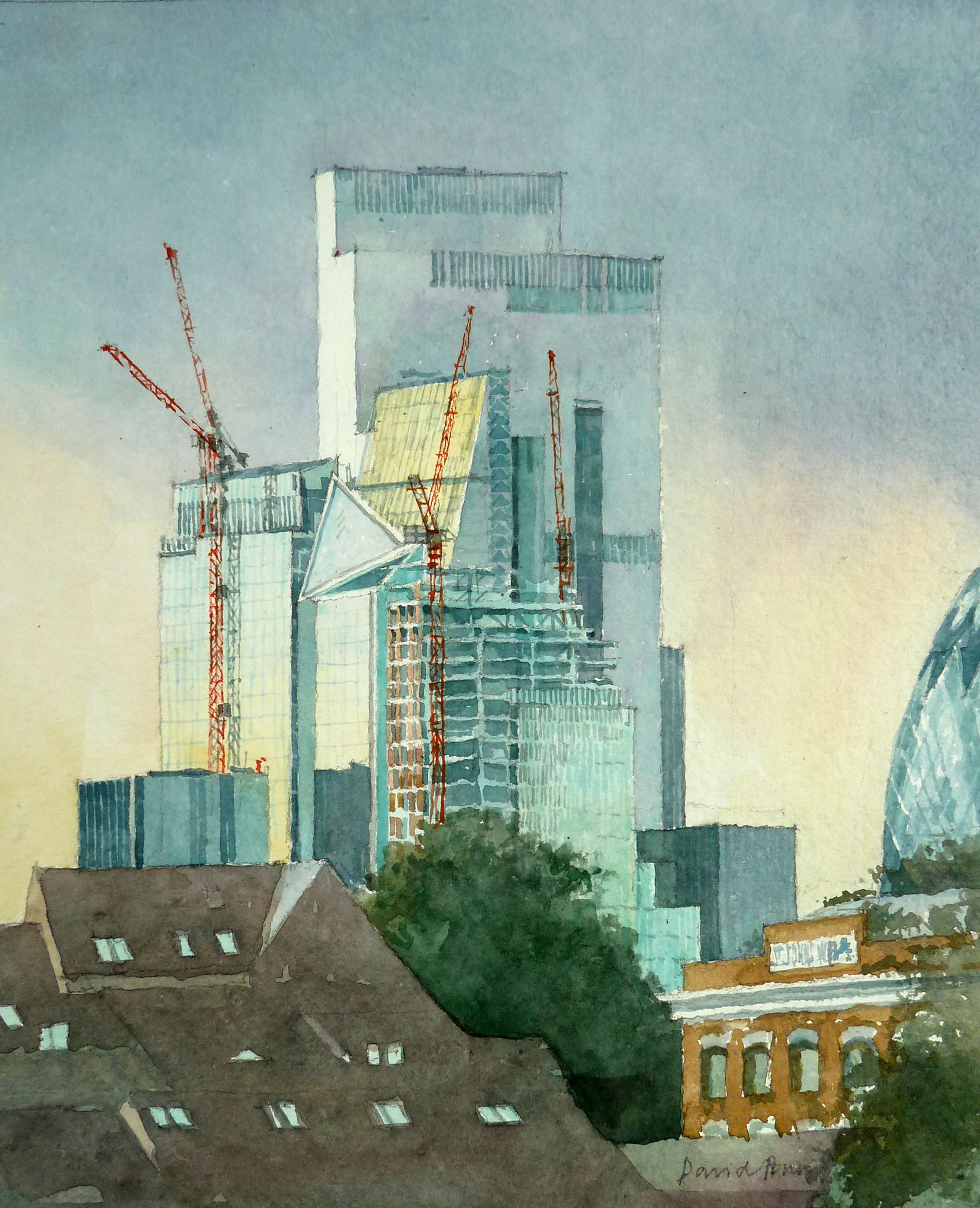 I try for structured compositions, probably due to my architectural background, and buildings are often present. Much of the development now going on is pretty awful but I feel the need to at least consider if it can be used. I paint with transparent watercolour on unstretched heavy paper usually at 20”x16”. The vagaries of the weather and working by water mean that glazes can take time to dry so my target is to draw fast, get the feel and mood down and finish off in the studio if necessary. I particularly enjoy the subtlety of watercolour, and sometimes the more direct impact of oils on board which can be more practical on damp days.