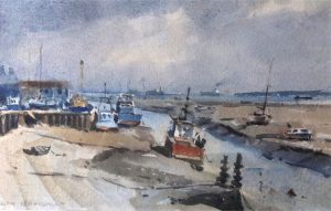 Alan became a personal friend of Vic and although Alan paints solely in watercolour and Vic Ellis was an oil painter he always admired the way Vic captured the atmosphere of the sea and skies of the Thames Estuary, and his expertise in depicting the Thames barges, the smacks and the bawleys which once were so commonplace. Alan was a great admirer too of many of the old Wapping Group artists when their exhibitions were held at the Royal Exchange and so he was delighted and honoured to be elected a member in 1987.