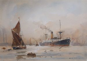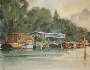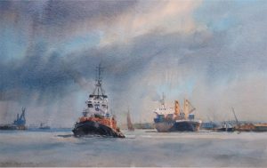 As well as being a ‘Wapper’ since 1987 Alan has also been a member of the RSMA since 2000 with whom he has been Treasurer and a member of the selection and hanging committee. He won the St. Cuthberts ‘Best Watercolour‘ award at the RSMA annual exhibition in 2002 as well as winning a similar award at the Essex Open exhibition at the Beecroft art gallery in Southend. He has had work purchased by the Port of London Authority, Port of Tilbury London Ltd, Southend Museums Service and by various shipping companies.