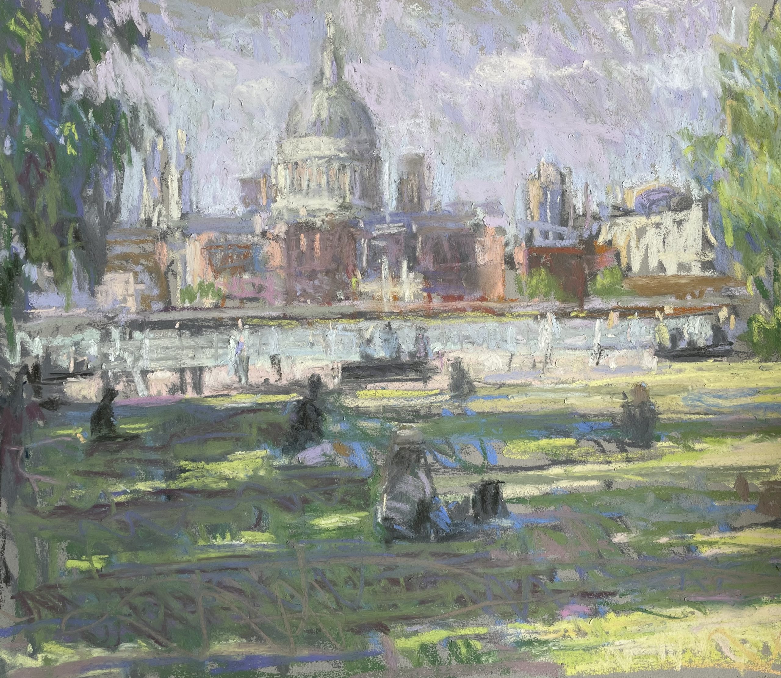 Louiseās work is about the transient moment; the rapidly changing light, colour and seasons and how it transforms people, buildings and objects. She always works en plein air, mainly in pastel which suits the fragility of time. It can be also be worked rapidly. There are 2 free light shows a day – never ending subject matter.