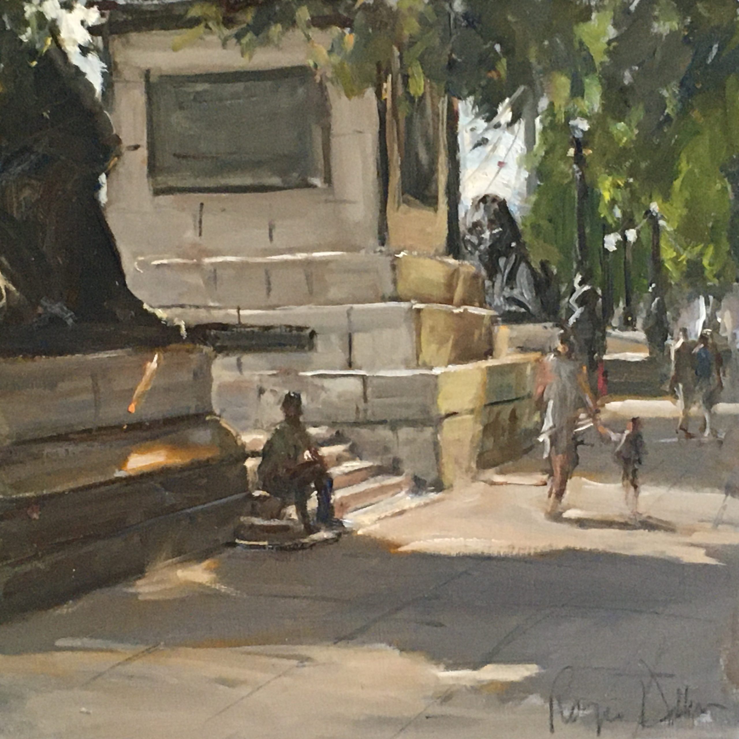 In tackling a painting on the spot my first objective is to work with an abstracted form, not allowing the drawing to take over and not documenting too soon. Thinking of general shapes of tone and colour and working with the composition in mind. Working from the general to the specific, not finalising anything until the composition feels right. Specifics and detail come towards the end. This is more the calligraphy stage. I will have been working from middle tones to dark accents then the highlights, holding on to the middle tones for as long as I can.